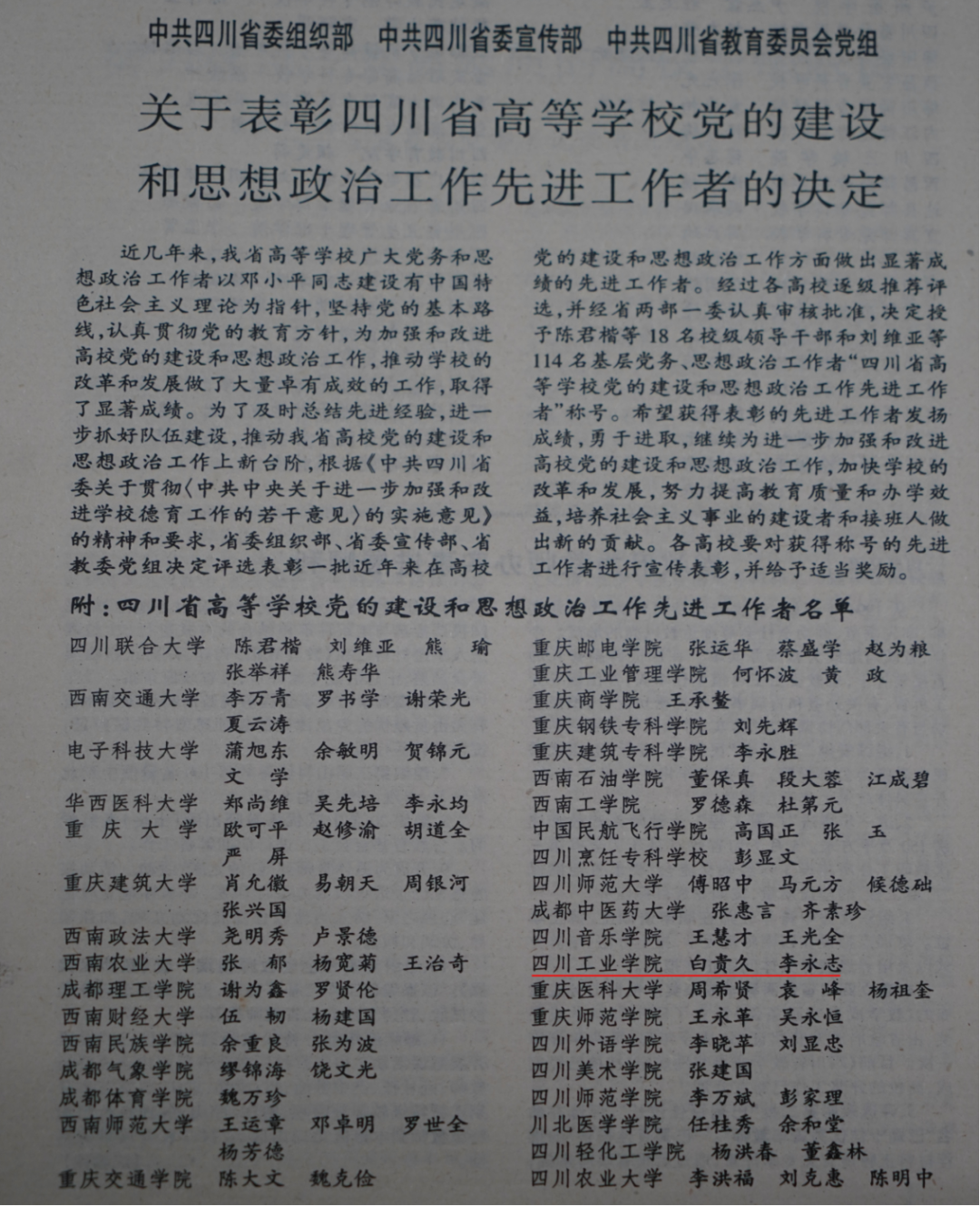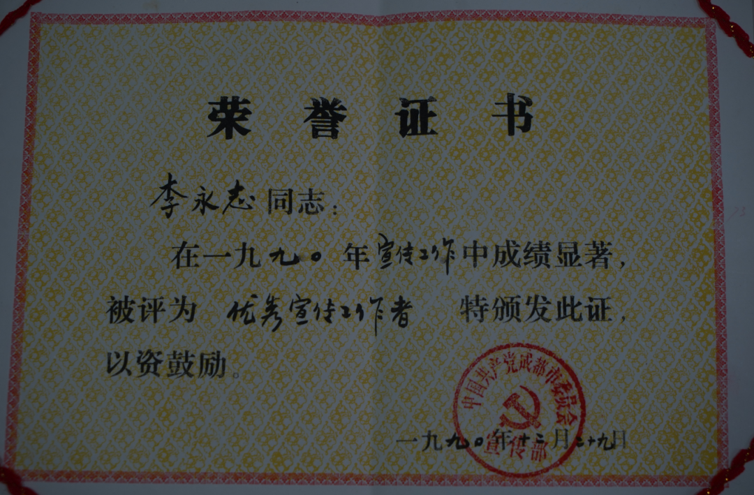 57年来不断的努力奋斗,李教授多次受到省、市、学校的表彰:1989年他被评为“四川工业学院先进教育工作者”;1990年被成都市委宣传部评为“优秀宣传工作者”;1993年被评为“四川工业学院党的建设和思想政治工作先进工作者”;1994年被评为“学院扑疫工作先进个人”;1994、1995年连续两次被评为学校优秀干部;1996年被省委组织部、宣传部、省教委党组评为“四川省高等学校党的建设和思想工作先进工作者”。